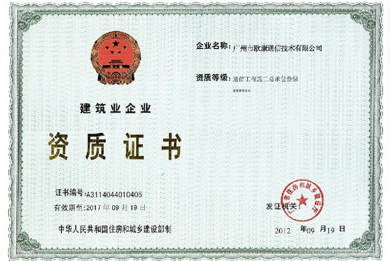 廣州市歐康通信技術有限公司在工作中科學管理,嚴把工程安全質量關,在2012年度通過廣東省住房和城鄉建設廳的資質審核,成為擁有通信工程施工總承包叁級的企業,使得我公司的施工資質再上一層樓。