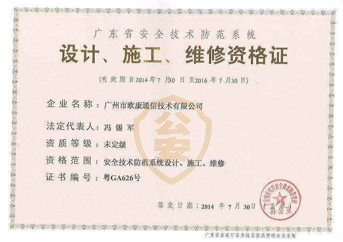 日,我公司喜獲由廣東省公安廳安全技術防范管理辦公室頒發的安防系統設計、施工、維修資格證,它標志著公司在不斷發展,不斷壯大。