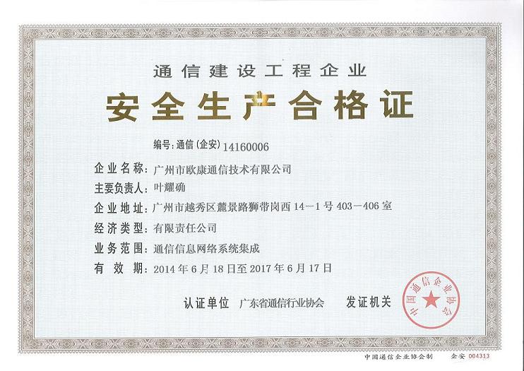 廣州市歐康通信技術有限公司在工作中科學管理,嚴把工程安全質量關,在2014年度通過廣東省通信行業協會以的資質審核,獲得了由中國通信企業協會頒發的企業安全生產合格證,使得我公司的工程施工資質再上一層樓。